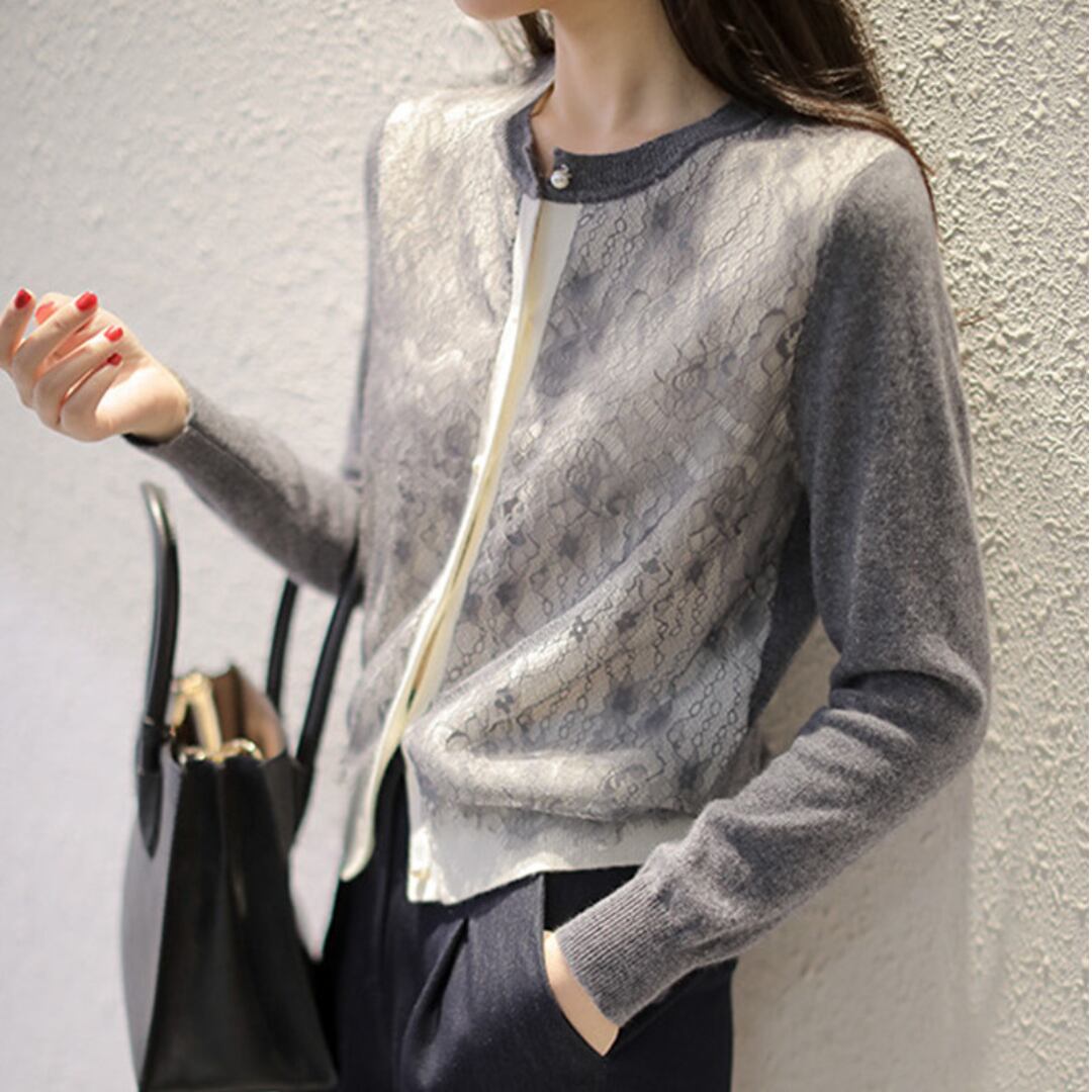 上質なフロントレースが特徴のフェミニンなカーディガン。