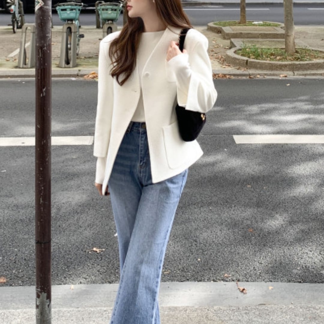 上質なツイード素材を使用し、フォーマルからカジュアルな日常まで幅広くコーディネートできる1着です。