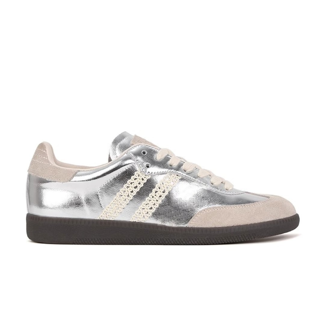 スタイリッシュなシルバーとレースデザインがラグジュアリーな印象を演出するスニーカーです。