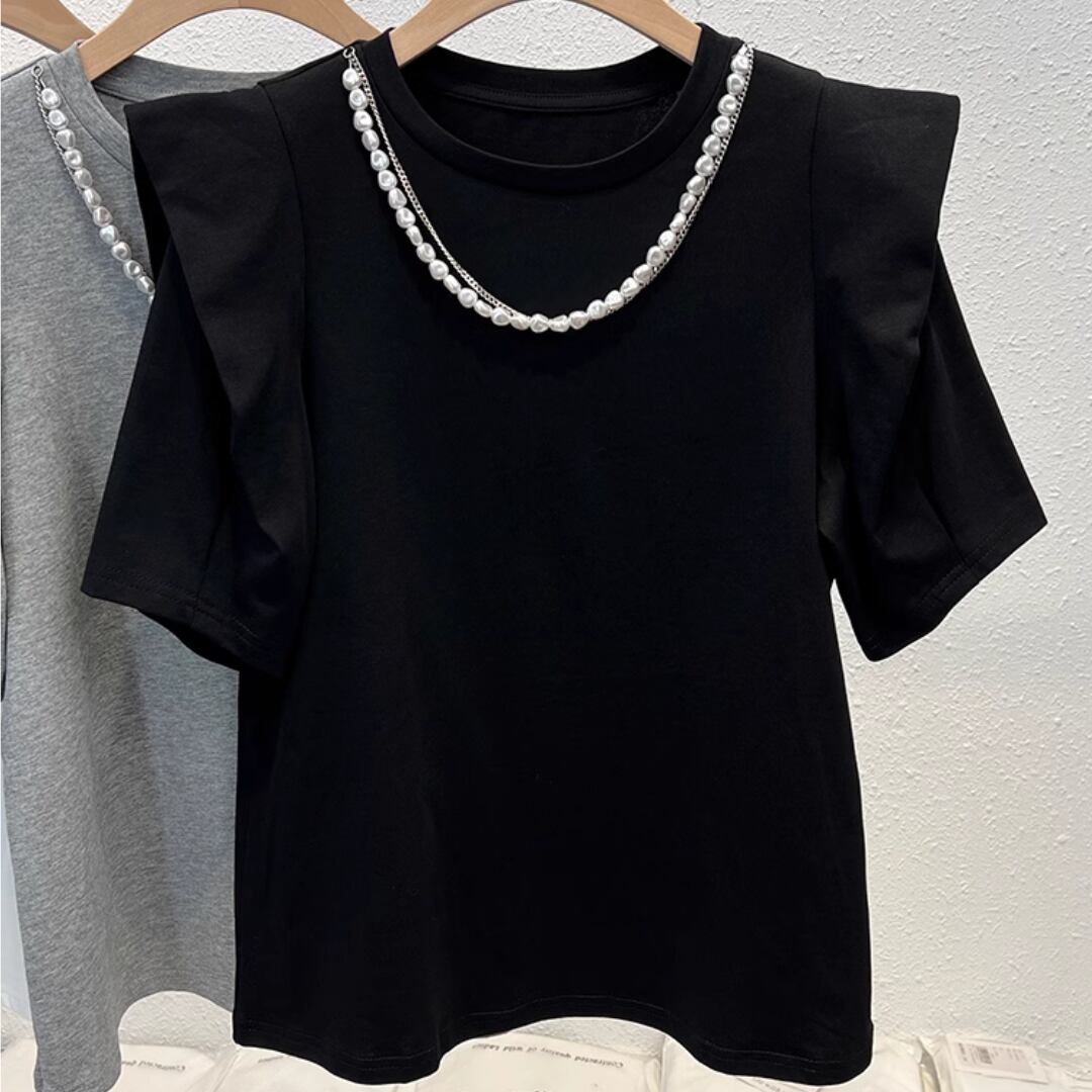 パールネックレス付きのデザインのトップス。