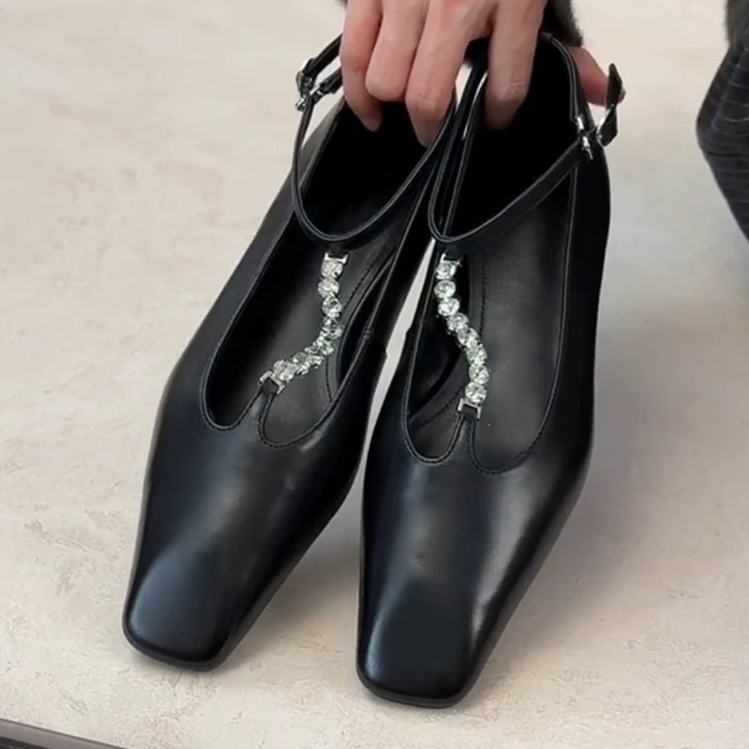 美しいビジューのストラップが足元を華やかに彩る、フラットパンプス。