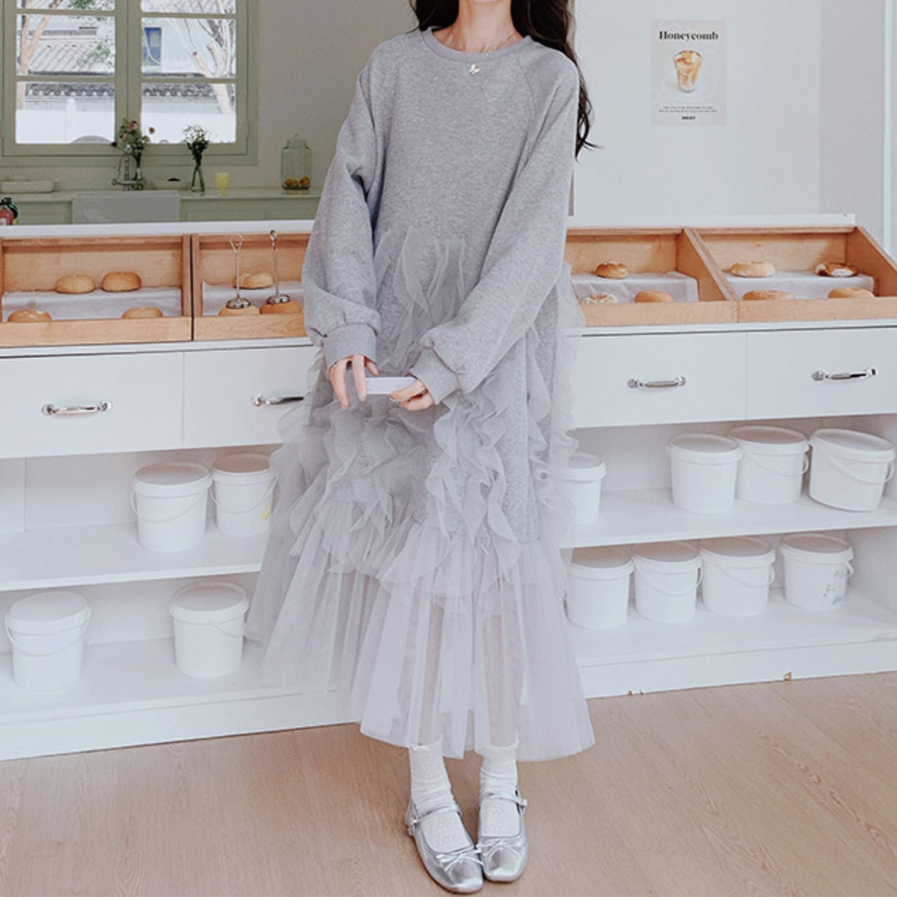 チュール素材をふんだんに使用した、エレガントで可愛い印象のチュールドッキング ワンピース。
