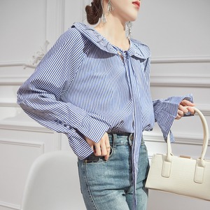 ストライプ柄の襟と袖のフリルが華やかさをプラスした、エレガントなブラウス。