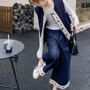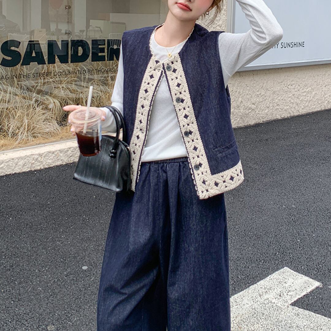 スタイリッシュなデニムベストと、デニムパンツのセットアップ。