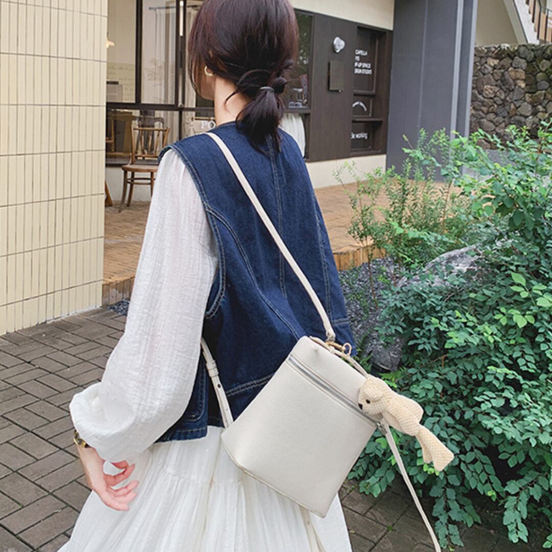 デニムベストとホワイトワンピースの清潔感が楽しめるセットアイテム。