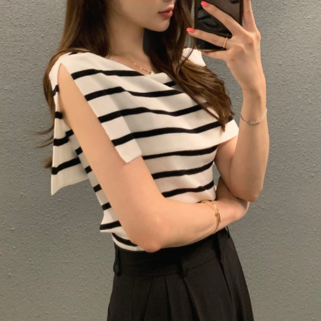 オフィスからカフェタイム、夏の夜のお出かけまで、あらゆるシーンで活躍する万能トップス。