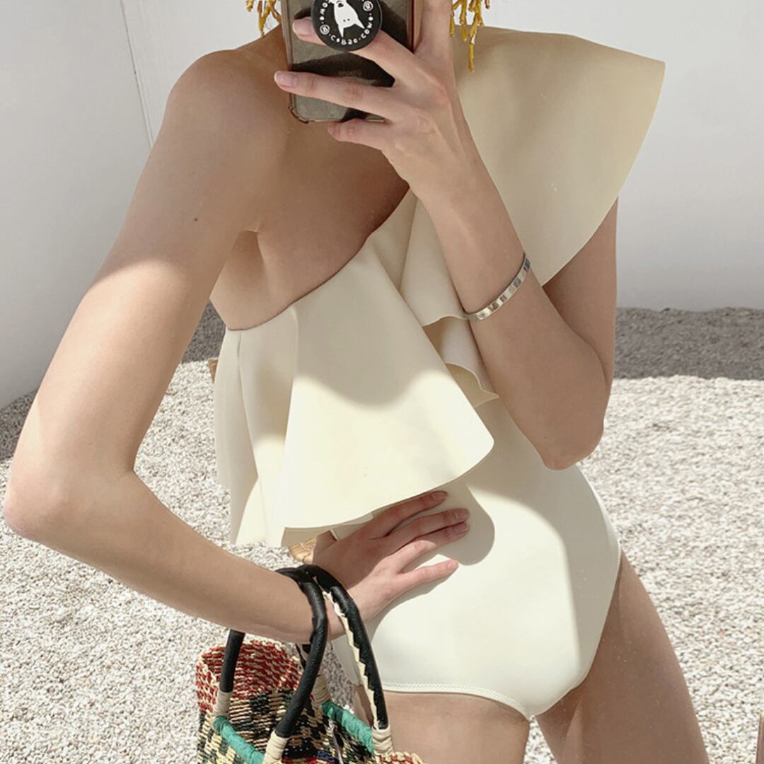 エレガントなワンショルダーデザインに、流れるようなフリルが美しく舞うスイムウェア。