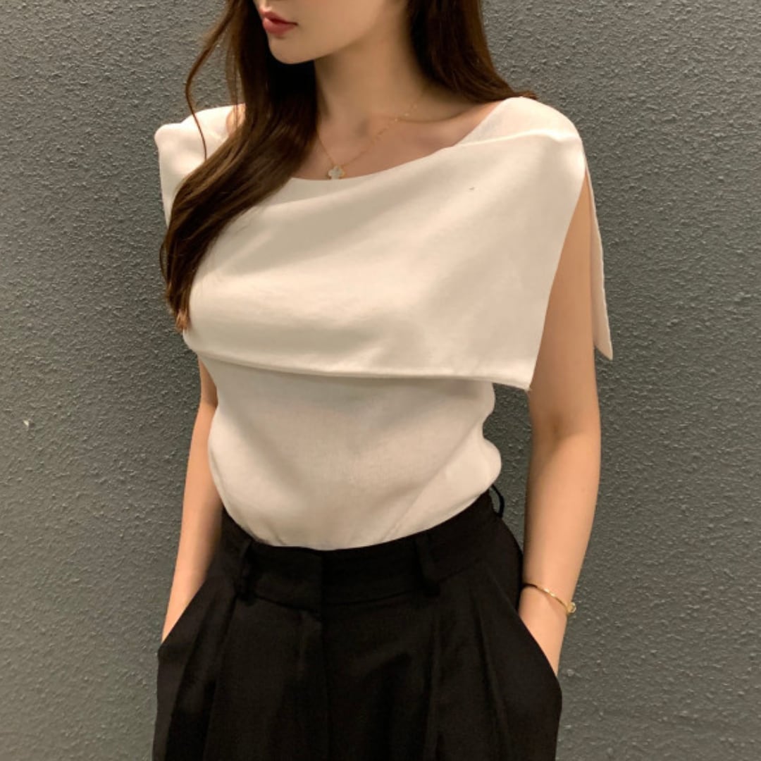 優美さと知性を兼ね備えたオフショルダー ケープ トップス。