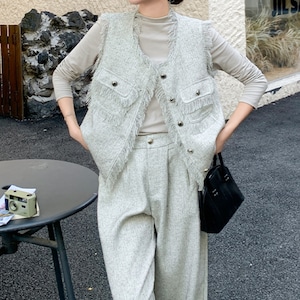 ベストのIラインで細見え効果、パンツのゆったりシルエットで体型カバーも完璧。