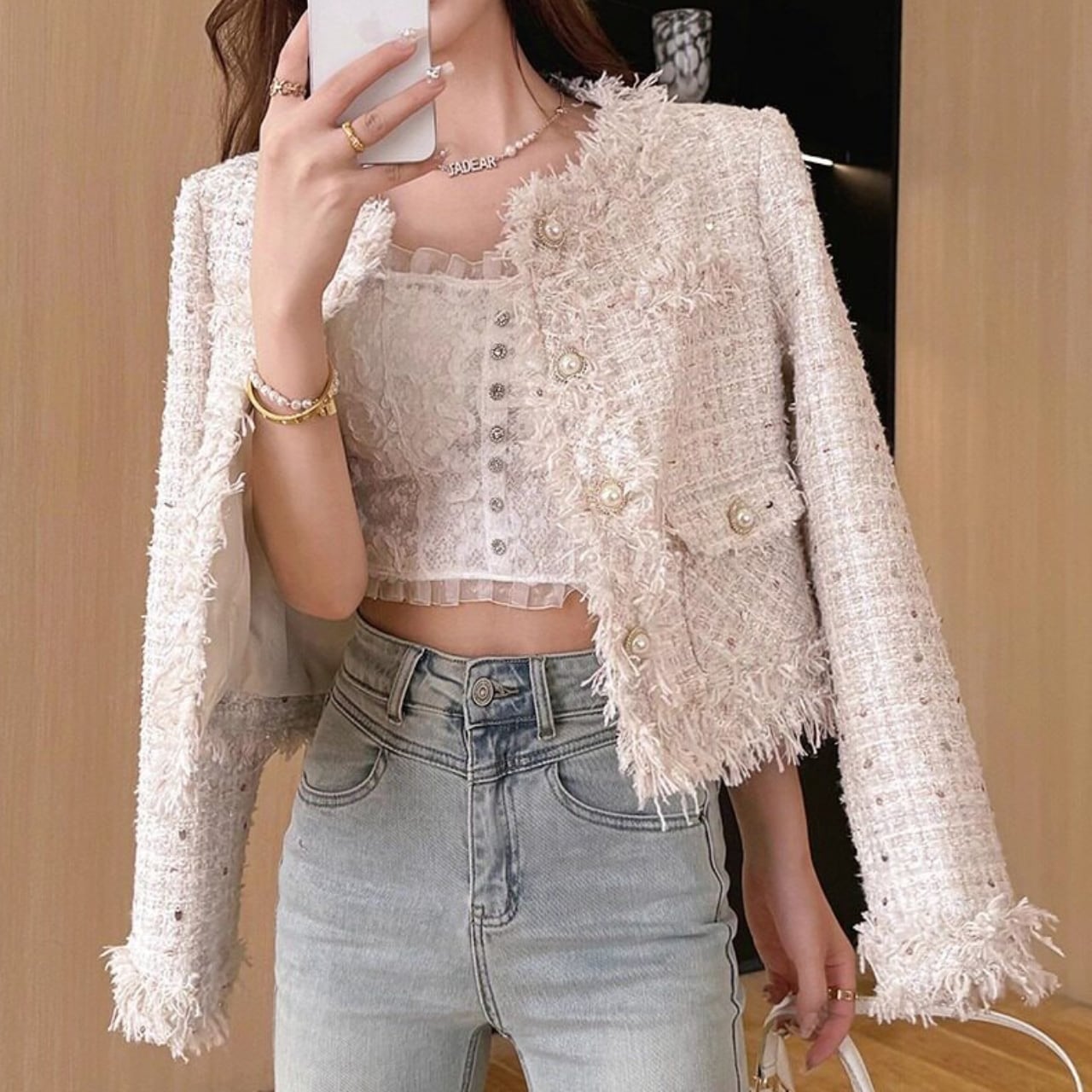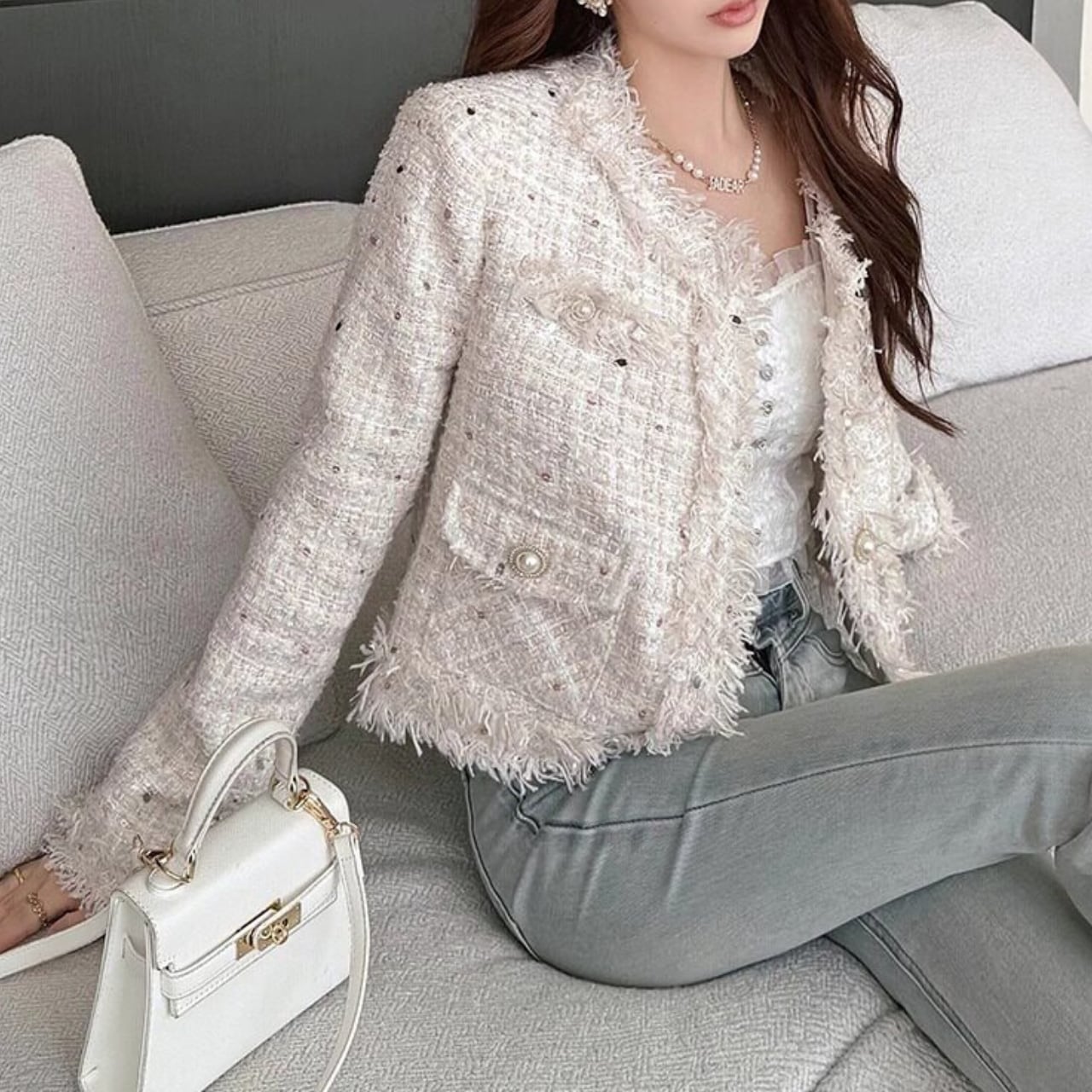 パールボタンとフリンジディテールが華やかさをプラスする、上品なツイードジャケット。