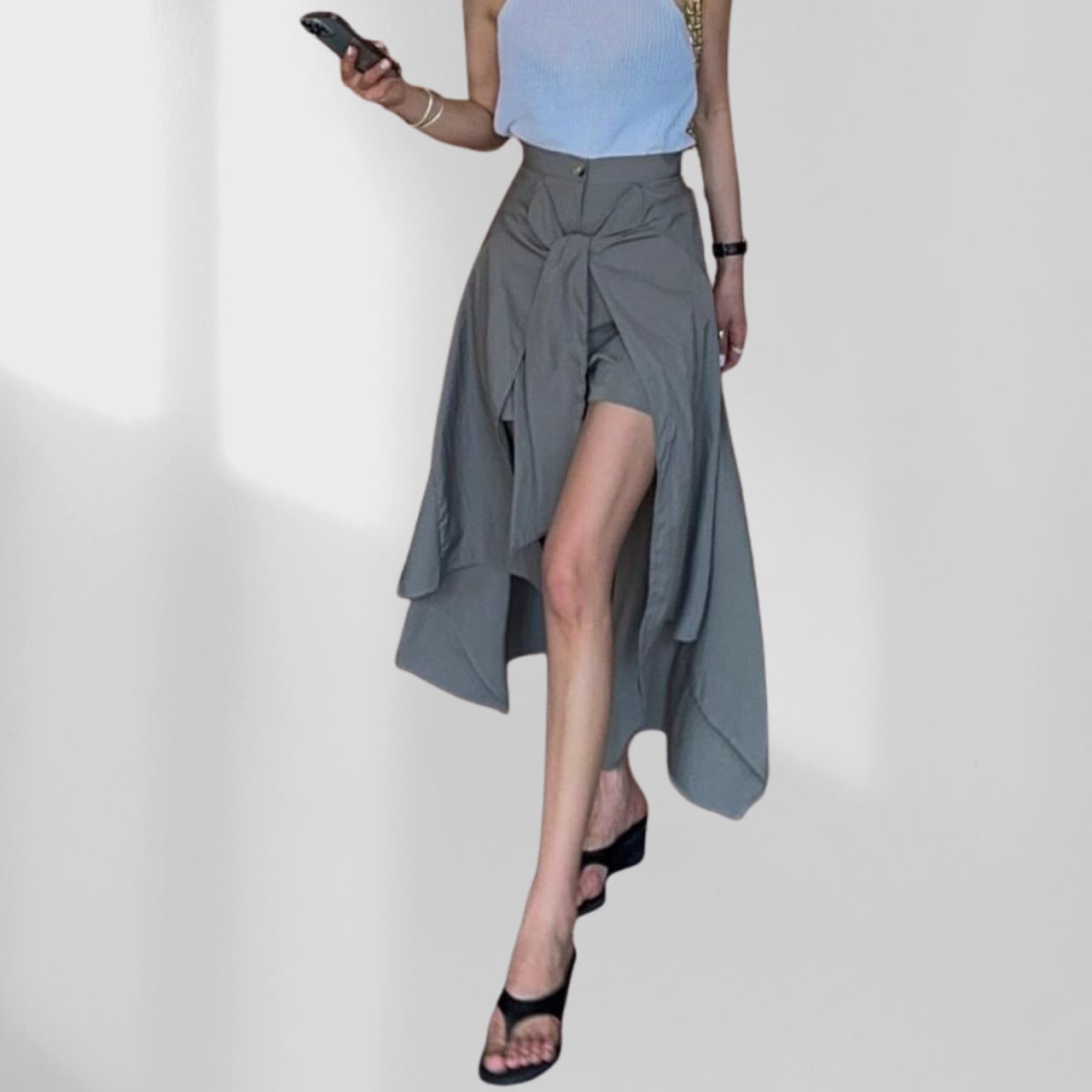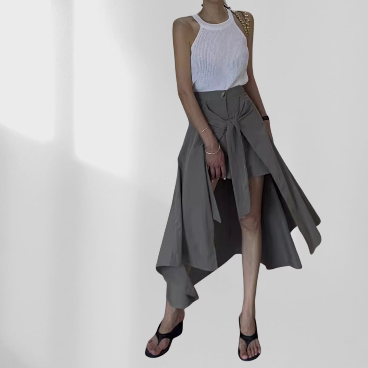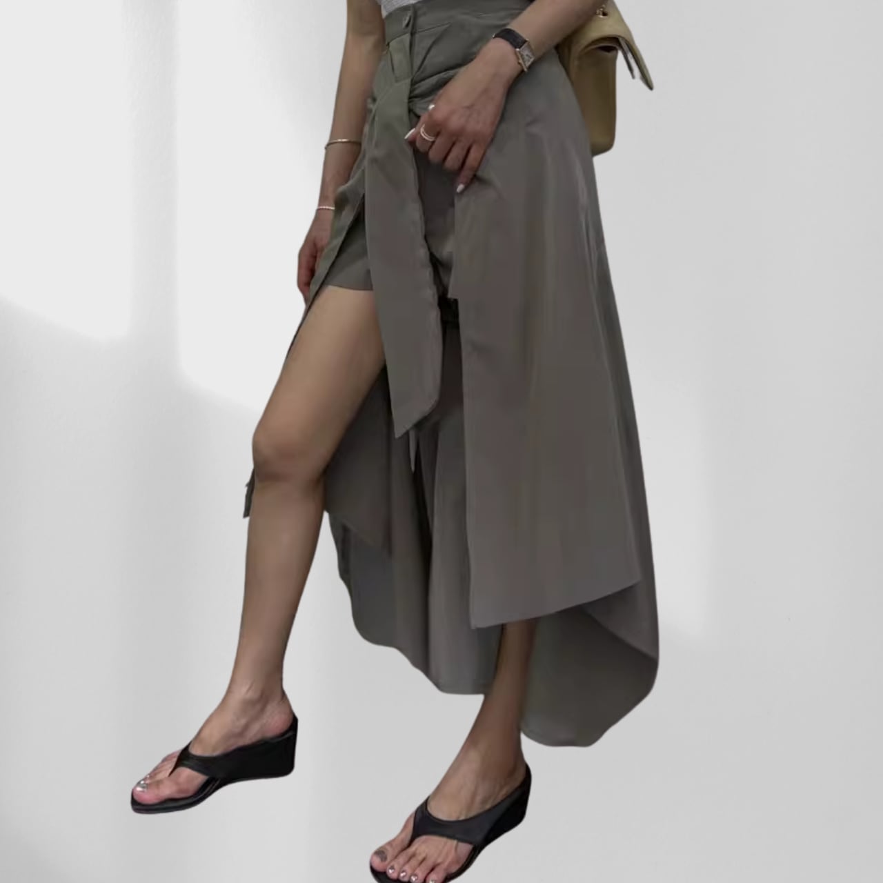 風になびくアシンメトリーの裾が個性的な存在感を放つ、他とは一線を画すデザインスカート。