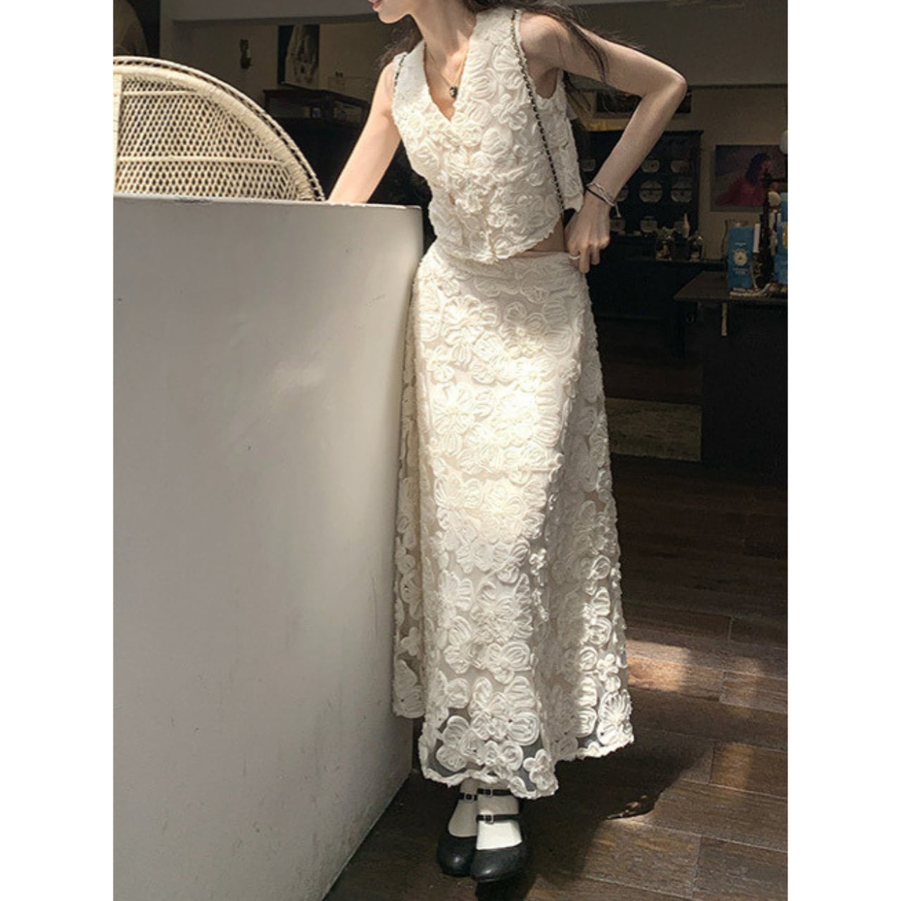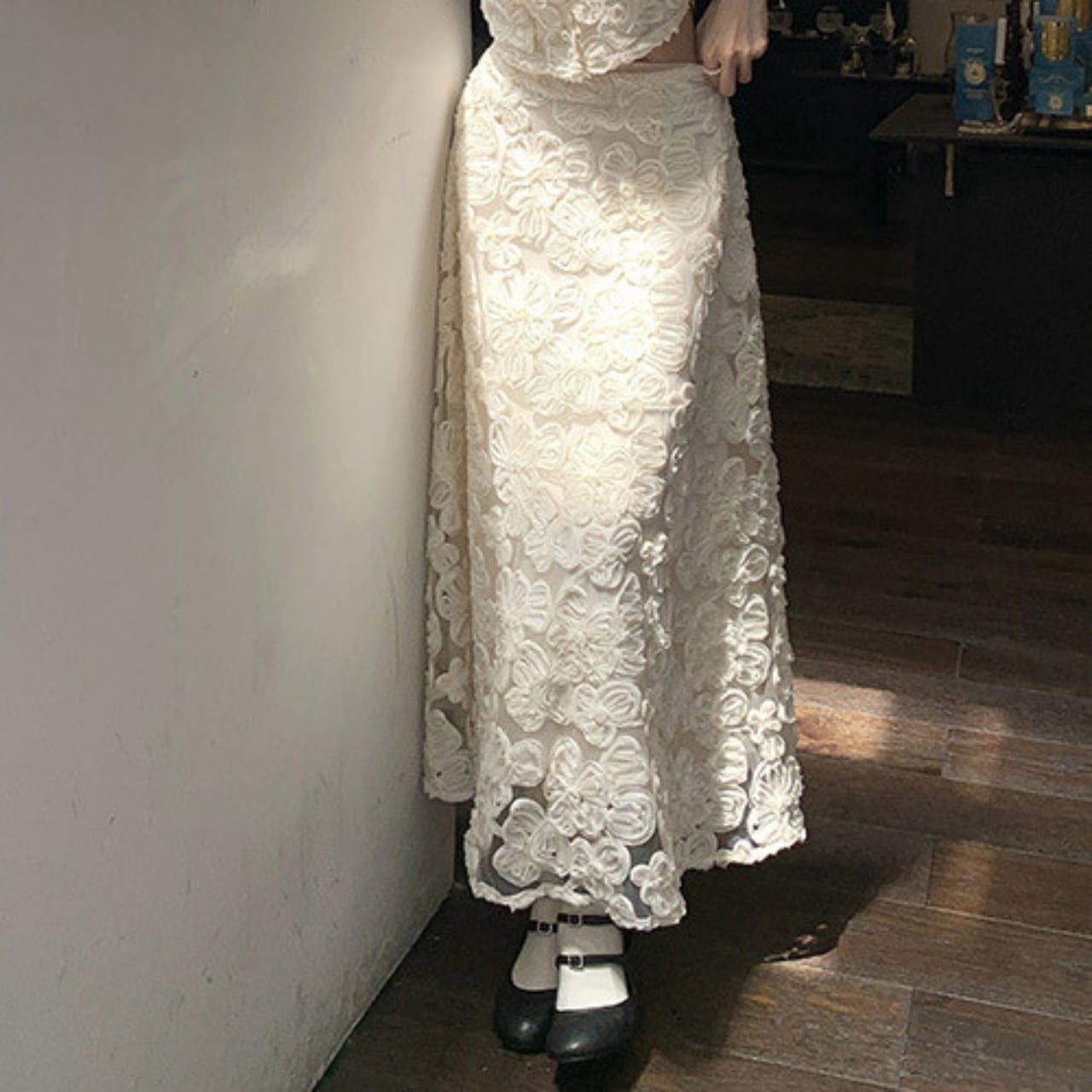 全面に咲き誇る立体的なフラワーレース刺繍が、光を受けるたびに繊細な表情を変え、華やかさを纏わせるセットアップ。