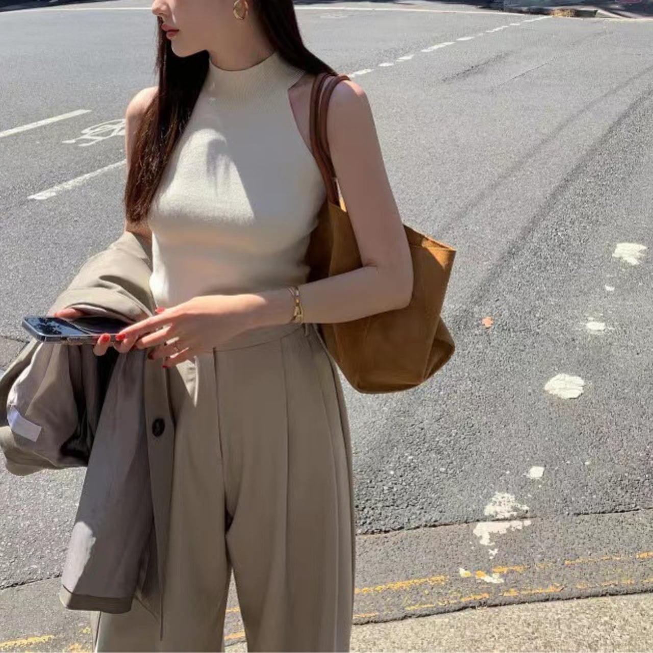 ミニマルなデザインだからこそ、アクセサリーがより一層輝き、全体のコーデに品格をプラス。