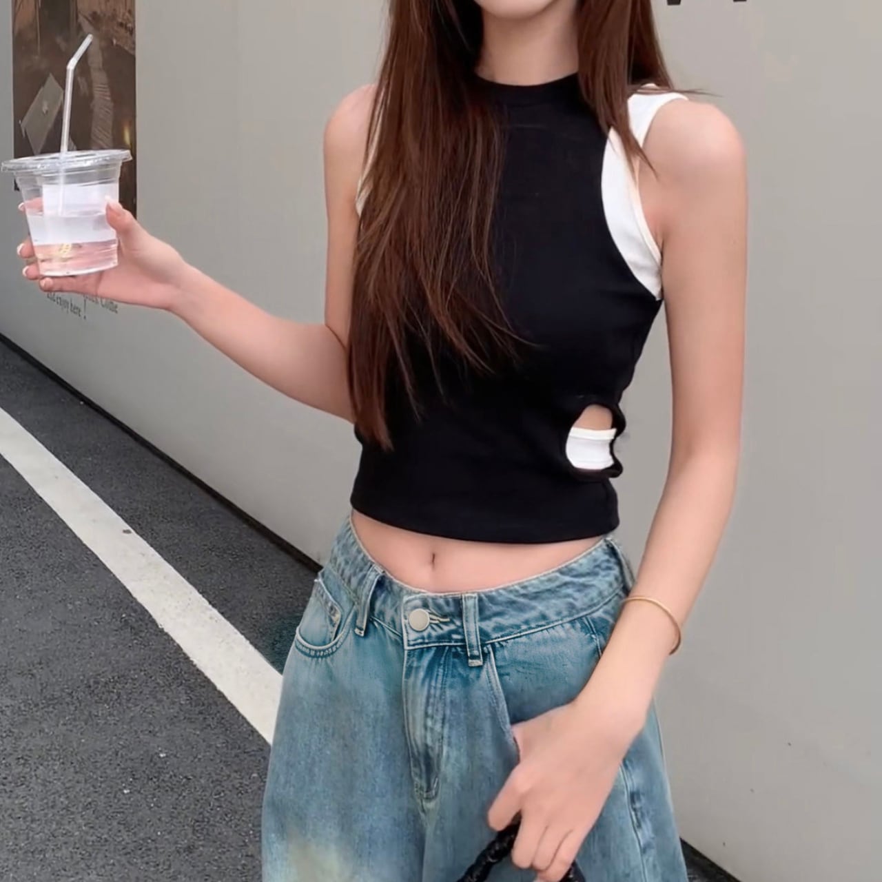 バイカラー サイドカット クロップド タンクトップ 3412913