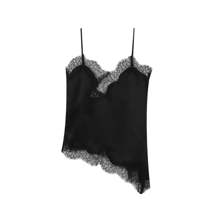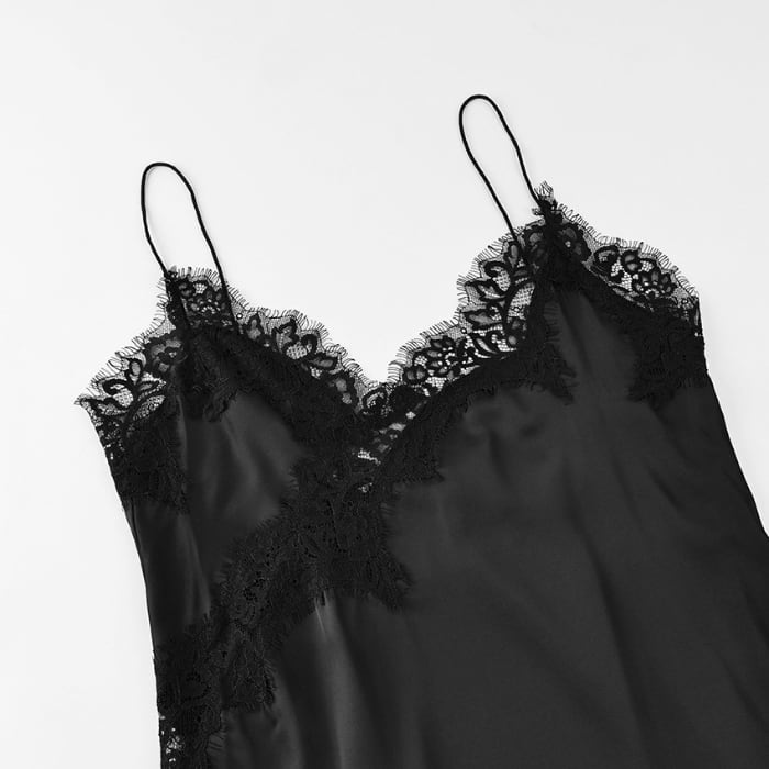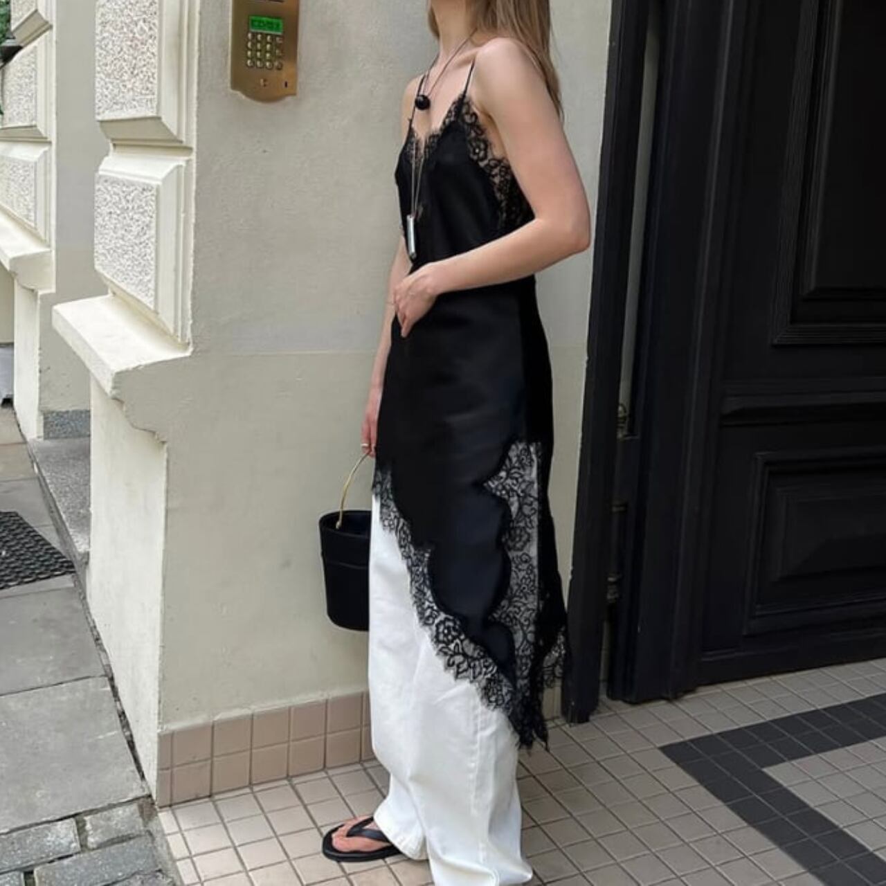 深いVネックが鎖骨からデコルテのラインをしなやかに美しく見せ、細いストラップが抜け感を演出。サテンのとろみが体のラインに沿ってしなやかに流れ、動くたびに光を纏いながら揺れる裾のレースが、女性らしさアップ。