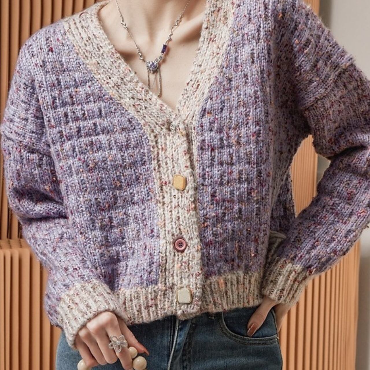 ツイード調 パープル ショート ニット カーディガン