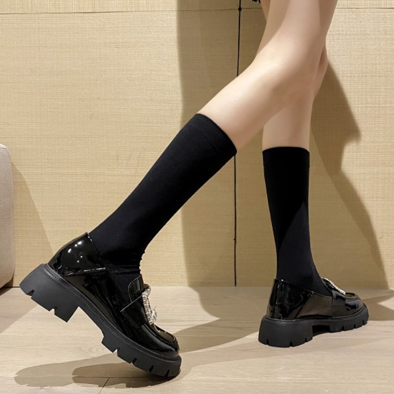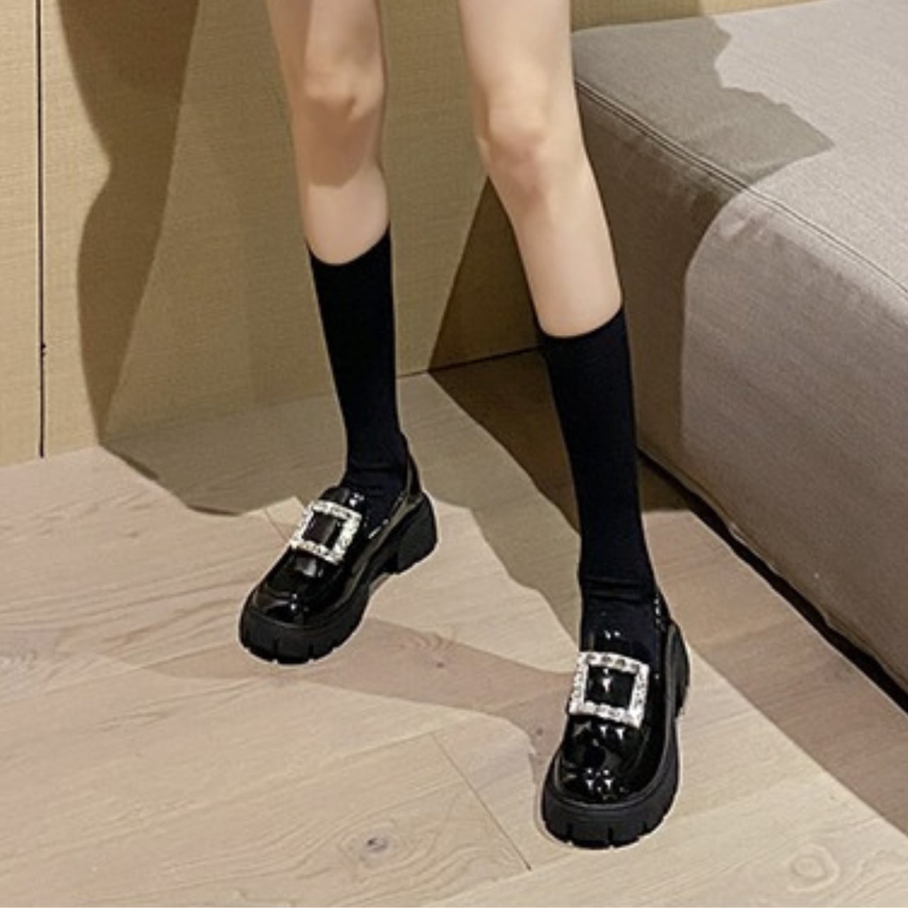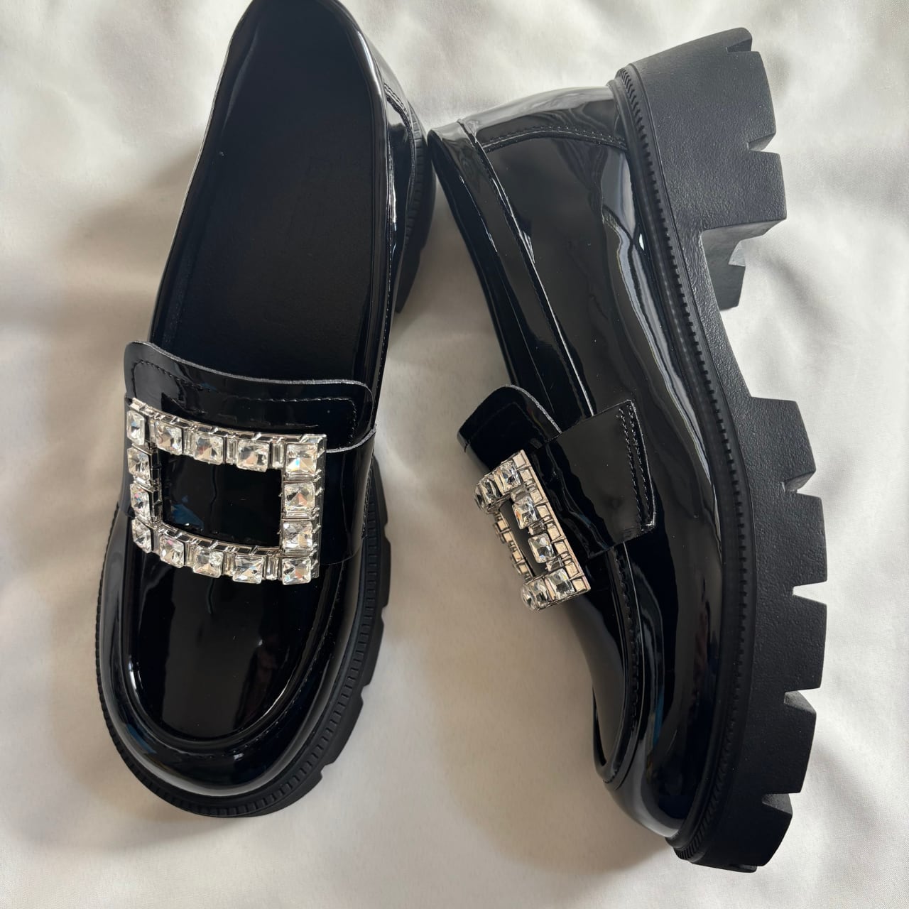 煌めくビジューとエナメル調の光沢感が魅力の厚底ローファー。