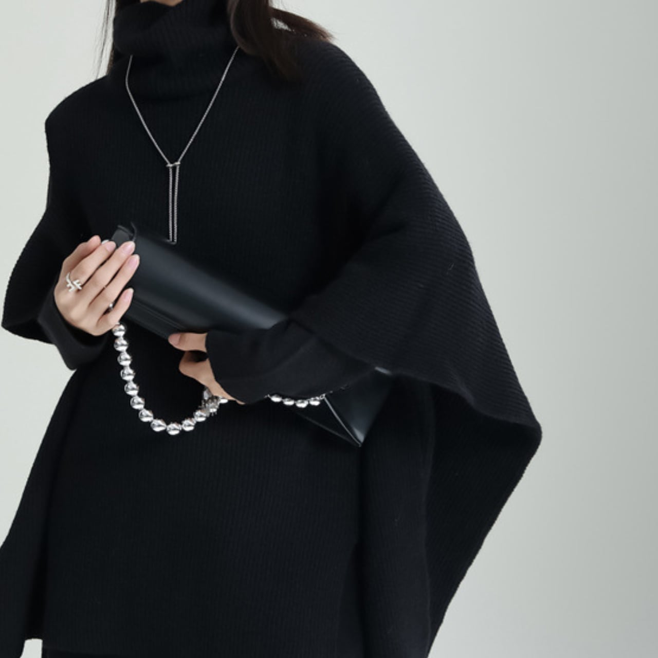 オシャレなルーズケープがふんわりと体を包み込み、ニットワンピースとの絶妙なバランスが魅力的です。