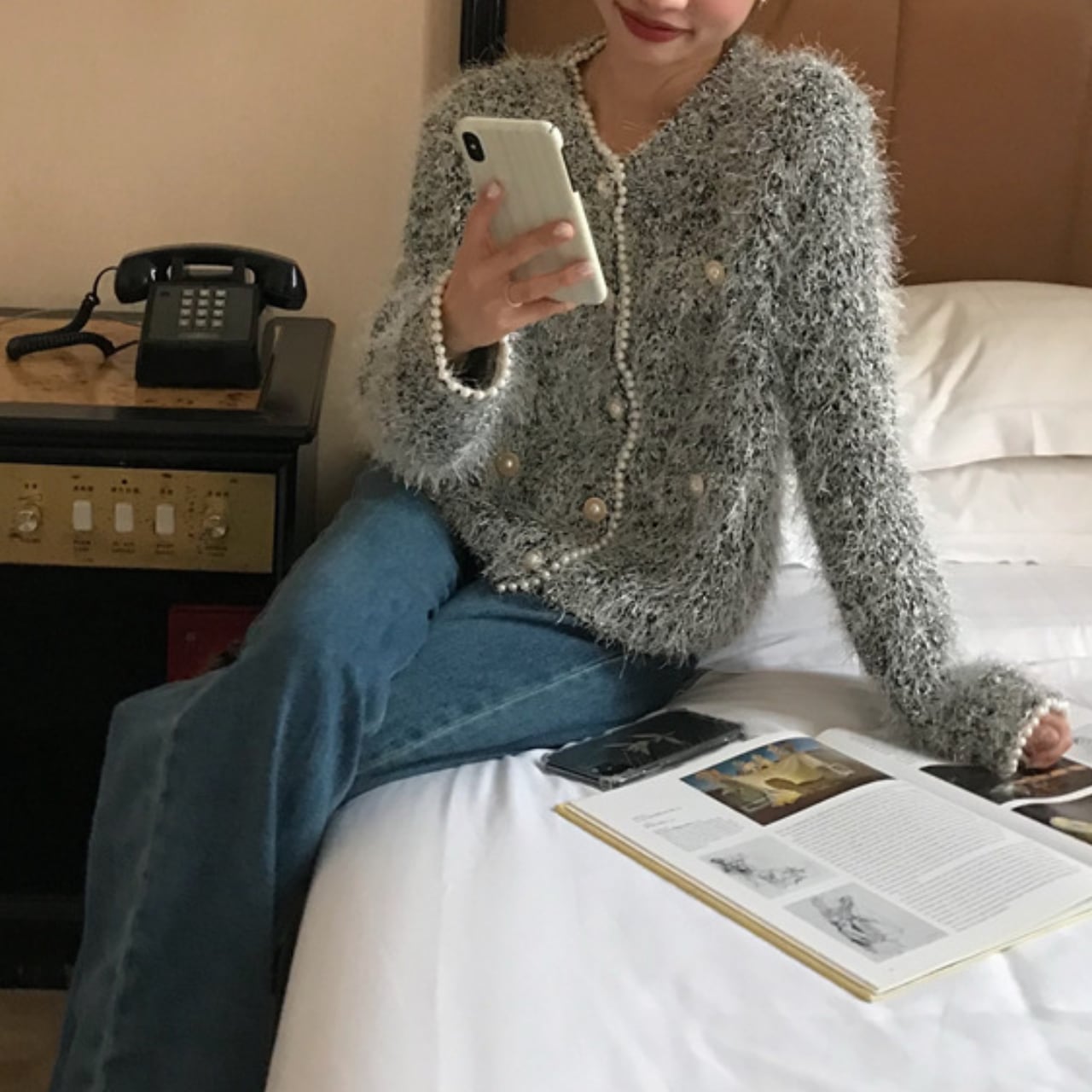 パールが可愛い華やかな印象を演出するシャギーカーディガン。
