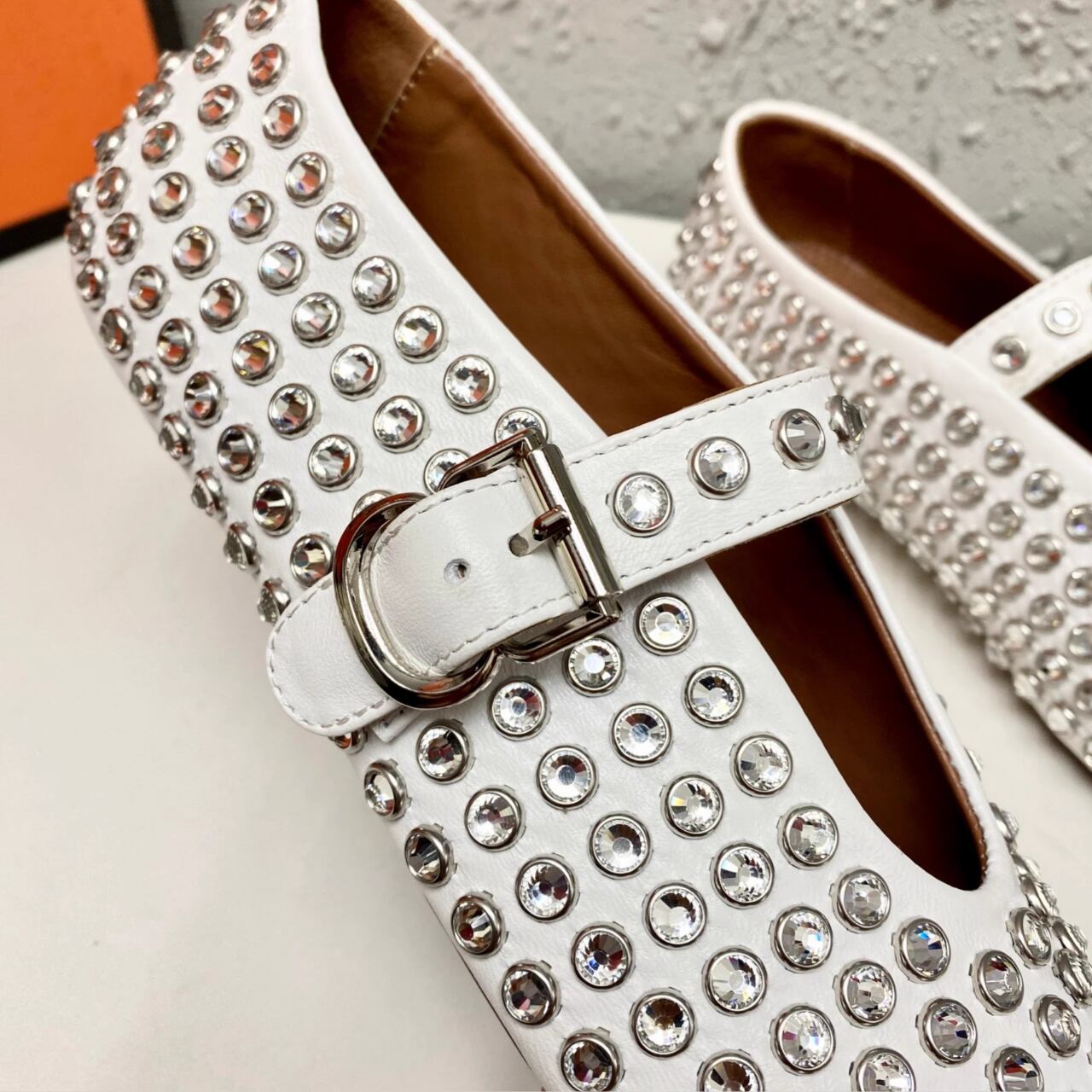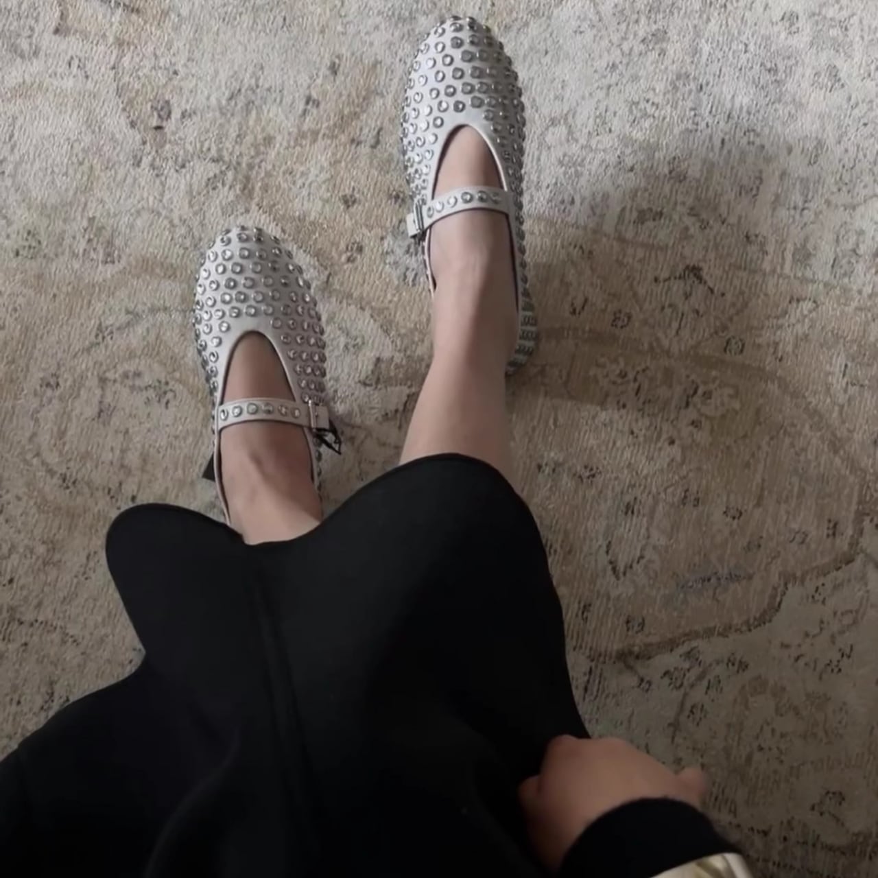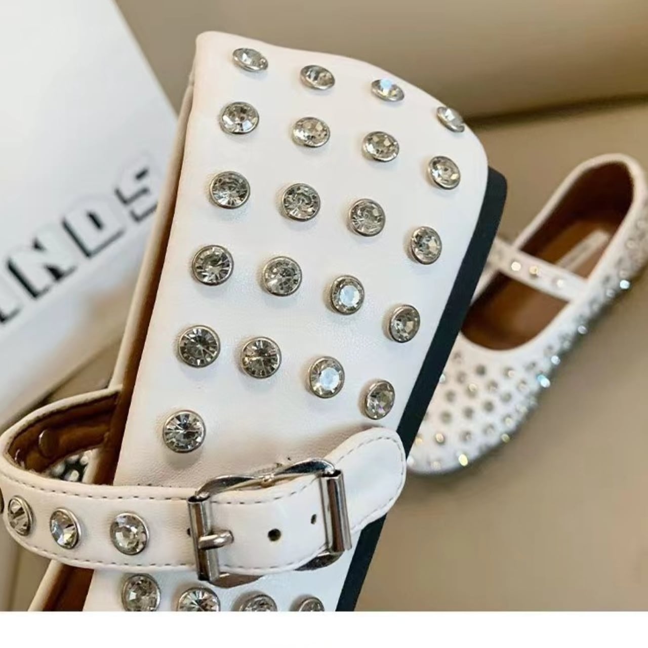 ラインストーンが散りばめられたこのバレーシューズは、シンプルながらも存在感を放つ一足です。