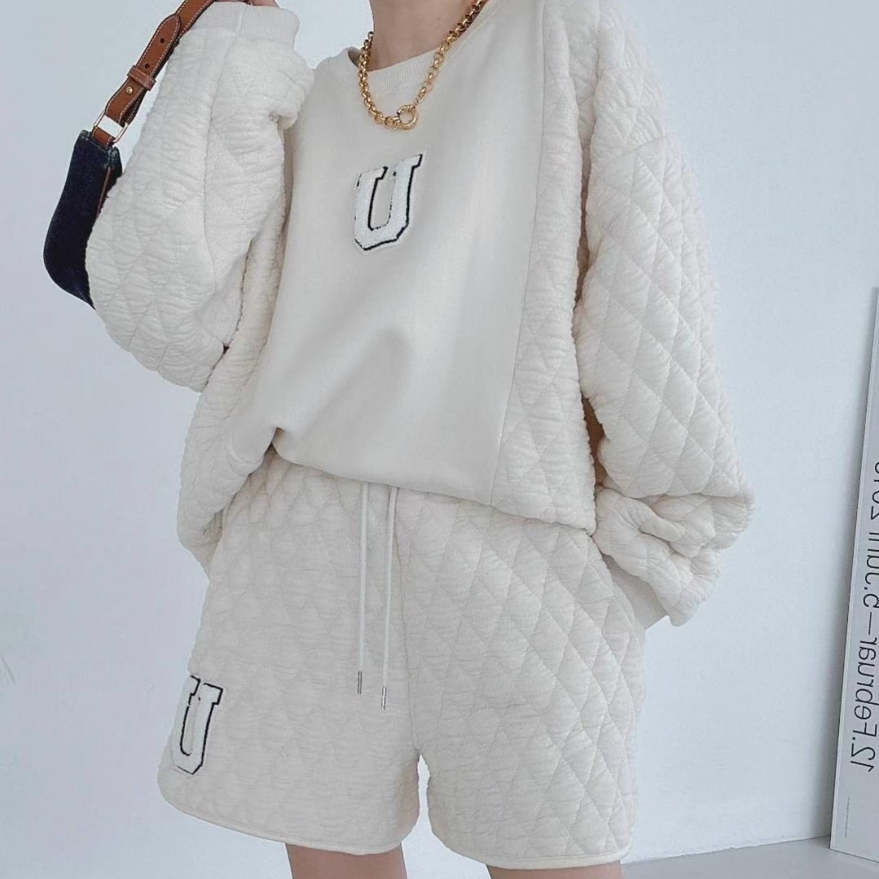シンプルなデザインながら、キルティング×ロゴのアクセントが存在感のあるセットアップ。