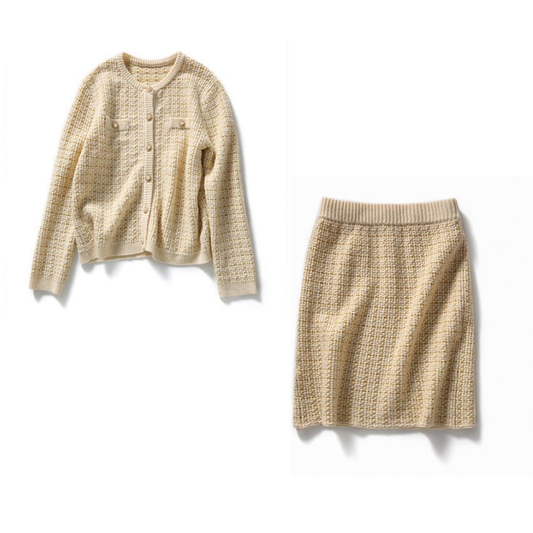 パールビジューボタンがアクセントとなり、ツイード素材を使用したエレガントなスカートセットアップです。