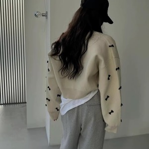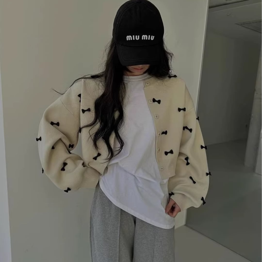 小さなリボンモチーフが散りばめられたフェミニンなカーディガン。